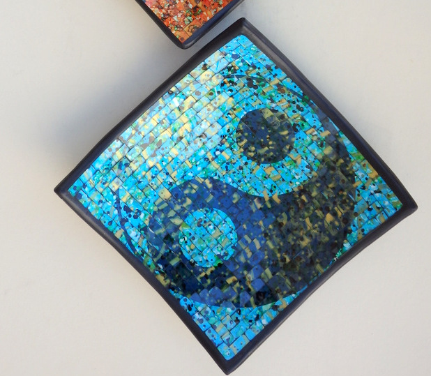 Výnimočná miska s motívom jin jang v oranžovom a modrom prevedení. Keramická miska s ručnou sklenenou mozaikou. Tyrkysovo modrá /čierna, doplnená zlatou . Vyrobené v Indonézii. Ezoterická miska má rozmer 19x19 cm, 24x24cm a 29x29cm. Rohy mierne zahnuté dohora.