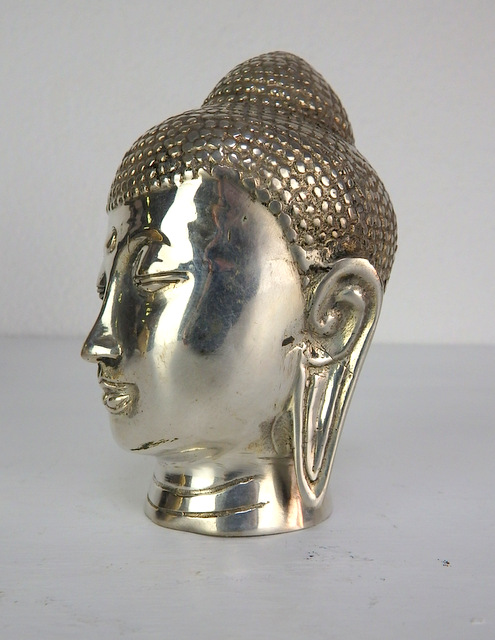 Soška z postriebrenej mosadze - BUDHA HEAD -Predstavujeme Vám túto očarujúcu sošku, ktorá môže ozdobiť Váš interiér, priniesť trocha umenia a potešiť Vaše oko. Táto soška predstavujúca Budhu je vyrobená z mosadze metódou strateného vosku, pričom každá jedna forma sa pri výrobe musí rozbiť. Preto je táto aj iné sošky z mosadze, vyrobené touto metódou jedinečná a nikdy nie sú dva rovnaké kusy, lebo na každú bola vytvorená iná forma. Rozmer: výška 12cm, váha: cca 205 gr.