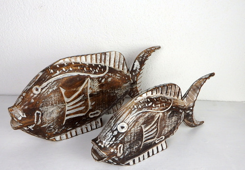 Dekoračné sošky RYBY - set 2 ks, sú ručne vyrobené z exotického dreva Albesia. Rybky sú malované v štýle shabby shick, bielo - hnedej kombinácii. Vyniknú hlavne v modernom alebo prírodnom interiéri. Rozmery: