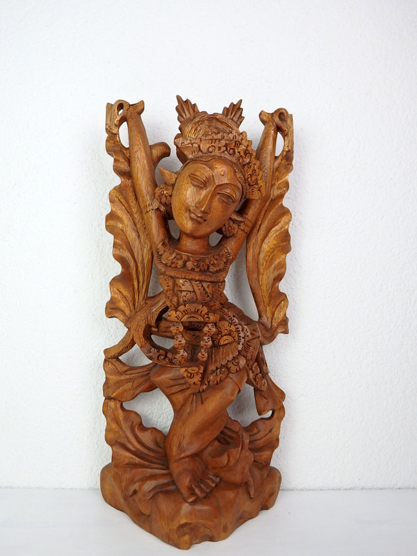 Drevená soška Tanečnica, vyrobená je ručne v Indonézii z tropického dreva Suar. Soška je vyrobená v Indonézii. Je to precízna práca, na soške zaujme hlavne krásne vypracovanie tváre a detailov. Niektoré sošky rovnakej veľkosti majú rozličné ceny a to podľa toho ako detailne sú vypracované. Je to hodnotná vec, ktorej cena stále rastie. Rozmery: výška: 50 cm, šírka: 20 cm.