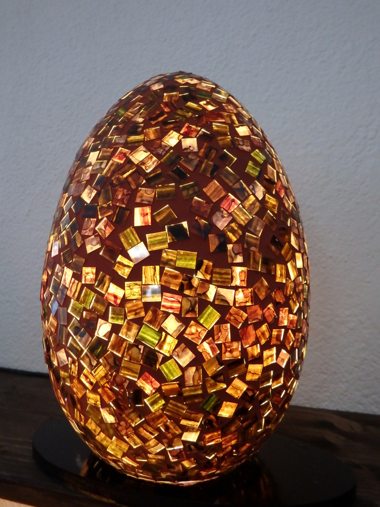 Stolná lampa ART EGG je luxusná , ručne vyrobená lampa zo sklenenej mozaiky, ktorá je pekným doplnkom aj cez deň. Pri zasvietení má nádherné farby, ktoré sú iné ako pri dennom svetle. šírka 22 cm, výška 30 cm. V ponuke na našom e shope máme aj iné tvary, veľkosti a farby. My sme použili teplú žiarovku, pri použití farebnej žiarovky biele časti zmeníte na farebné, čím môžete lampu takto farebne zamieňať.