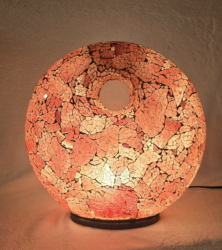 Krásna červená lampa v tvare Donat prekvapí po zasvietení. Lampa je celá vyrobená ručne. Každá má svoj jedinečný dizajn. Zasvietená svieti červeno miestami do oranžova. Táto lampa Vám cez deň poslúži ako dizajnový doplnok a večer ako osvetlenie. Rozmer: výška 25cm - š.: 24 cm, výška: 30 cm - š.: 29 cm, výška: 35 cm - š.: 35 cm. Lampa je obojstranne rovnaká. Materiál: ručná mozaika - sklo, drevený podstavec. Dodáva sa bez žiarovky. Napätie 220-240 V, použite LED žiarovky.