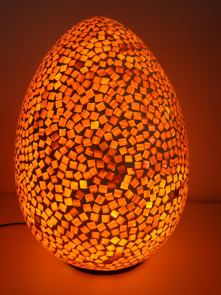 Luxusná stolná lampa v tvare vajíčka. Krásna dekorácia, či už zasvietená alebo zhasnutá. Večer rozžiari celý interiér. Intenzitu môžete korigovať žltou alebo bielou žiarovkou. Lampa je ručne vyrobená zo sklenenej mozaiky nazdobenej na sklolaminátovom tele. Je to malé umelecké dielo a každý kus je oritinálny svojim vzorom, tvarom a farbami. Vhodný aj ako darček. Rozmery: výška 35 cm a 50 cm. Podstavec je z dreva. Napätie 220-240V, na jednu LED žiarovku E27. Žiarovka nie je súčasťou balenia.