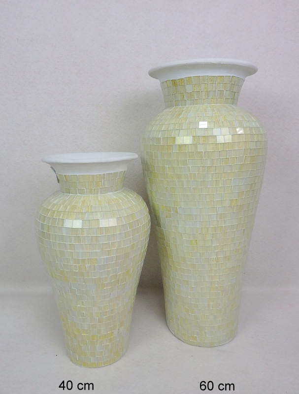 Krásna váza - luxusný doplnok do Vášho interiéru, farba je jemne vanilková so zlatým popraškom čo podčiarkuje jej originalitu. Váza je ručne vyrobená aj sklenená mozaika, preto je každá originálom či už tvarovo alebo skladbou mozaiky. Vázu používajte na suché kvetinové dekorácie prípadne používajte plastovú náplň.