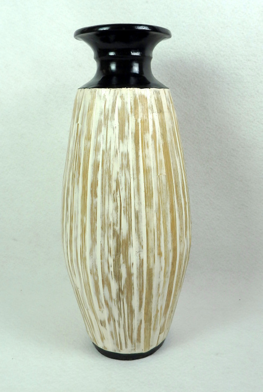Krásna ručne vyrobená dekoračná váza z prírodných materiálov ako terakota, exotické listy z palmy sú naozaj pravé a zakomponované v tejto váze. Je to naozaj originálny skvost ktorý nesmie chýbať ak máte radi prírodné materiály a ich odtiene . Váza má výšku 60 cm. Vázu používajte len na suché kvetinové dekorácie.