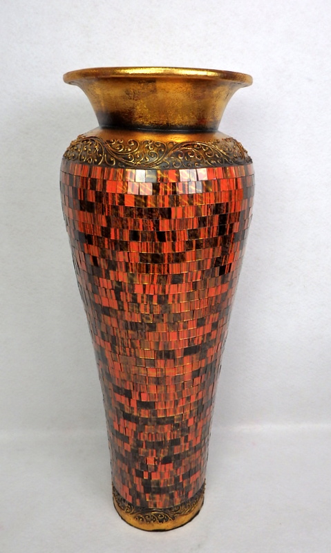 Luxusná dizajnová váza farba oranžová s čiernymi pásikmi . Keramická váza je zdobená sklenenou mozaikou Vrchná a spodná časť sú maľované zlatou farbou a zdobené vzormi. Všetko ručne. Keďže sa jedná o ručnú prácu keramickej vázy aj maľovanej sklenenej mozaiky, ktorá je na vázy lepená, každá váza je špecifická svojim tvarom a farebnosťou. Každá je originálnym umeleckým dielkom. Dovoz Indonézia. Krásna kombinácia farieb rozžiari Váš domov. Výška je 80 cm. Vázu používajte len na suché kvetinové dekorácie.