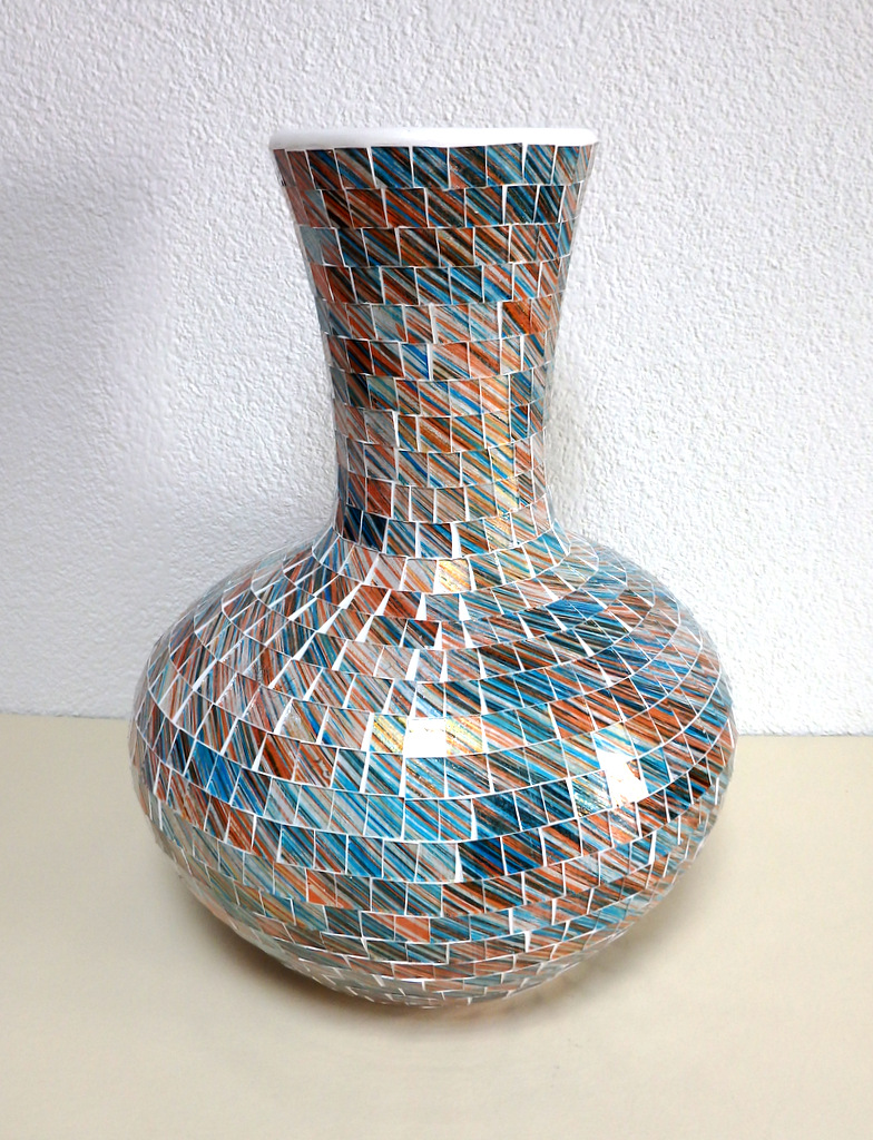 Krásna belasá mozaiková váza, ručná sklenená mozaika - plný guľatý tvar. Každá váza je ručná keramika aj sklenená mozaika, preto ani jedna nie je rovnaká tvarom ani vzorom. Každá je jedinečný ručný originál s úžasnými farbami, táto je v belaso zlato škoricovej kombinácii a myslíme si, že sa veľmi vydarila. Vyrobené v Indonézii. Ak vo vašom interiéri niečo chýba, možno toto je tá posledná bodka, ktorá mu dodá exotickú originalitu a jemnú pastelovú farbu. Vázu používajte na suchú kvetinovú dekoráciu, v opačnom prípade použite plastovú náplň.