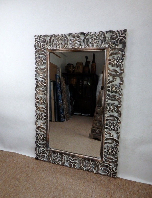 Nádherné zrkadlo s vyrezávaným rámom veľkosti 120 x 80 cm, hrúbka dreva až 2,5 - 3 cm. Drevený rám je vyrobený z dreva SUAR a vyrezávaný ručne, pochádza z Indonézie. Krásna ručná práca špičkového drevárskeho majstra. Zadná strana zrkadla je vystužená drevenou doskou, vzadu na ráme dva háčiky na zavesenie. Dovezené v limitovanom počte kusov. Vhodné zavesiť na výšku aj na šírku . Dovoz Indonézia.