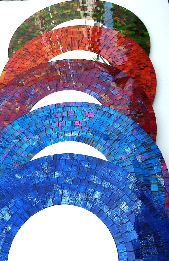 Luxusné okrúhle zrkadlo ručne robené, zdobené sklenenou mozaikou . Pochádza z ďalekej Indonézie. Priemer zrkadla: 50 cm, šírka rámu 13 cm. V troch farbách: oranžová, zelená a tmavá modrá. Farby sú krásne sýte, veľmi jasné a zvýraznené trblietavým popraškom.