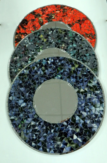 Luxusné okrúhle zrkadlo ručne robené, zdobené sklenenou mozaikou . Pochádza z ďalekej Indonézie. Priemer zrkadla: 50 cm, šírka rámu 13 cm. V troch farbách: čierna - čiernosivá, červená a tmavá modrá. Farby sú krásne sýte, veľmi jasné a zvýraznené dvoma zrkadielkovými pásmi.