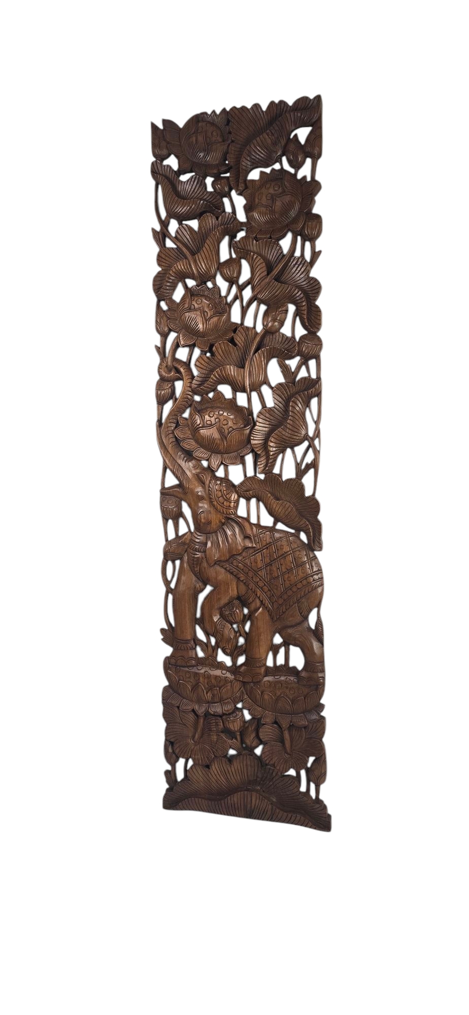 Dekorácia na stenu - panel s motívom SLONY- vyrezávaný z teakového dreva, mohutný a veľkolepý - výška 180 cm, šírka 45cm, hrúbka dreva je 3,5 - 4 cm. Prinesie teplo a exotiku a jedinečnosť do Vášho interiéru. Týmto originálnym kúskom určite neurobíte prešľap ani po investičnej stránke, keďže cena drevorezieb a teakového dreva neustále stúpa. Obrazy sú duálne - ako set 2 kusy - pravý a ľavý.