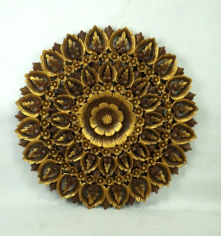 Drevená dekorácia na stenu Mandala ELANOR , ručne vyrezávaná , priemer 90 cm. Vyrobená z masívneho teakového dreva ( Tectona Grandis). Táto pochádza z kúzelného exotického Thajska. Predstavuje kvet lotosu a jeho okvetné lístky. Pri pohľade na mandalu vidíte skúsenosti a zručnosť majstra. Krásu a výnimočnosť tohto diela znásobuje kresba dreva a štruktúru podčiarkuje zlatá farba. Hrúbka dreva až 4 cm. Čistá hmotnosť obrazu je 18 kg.