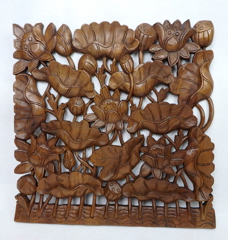 Dekorácia na stenu LOTOSY z exotického teaku (Tectona Grandis). Mohutná ručná 3D drevorezba, dovoz Thajsko. Rozmer 60x60 cm, hrúbka dreva až 2,5-2,8 cm, svojou hrúbkou pôsobí veľmi honosne a majestátne.