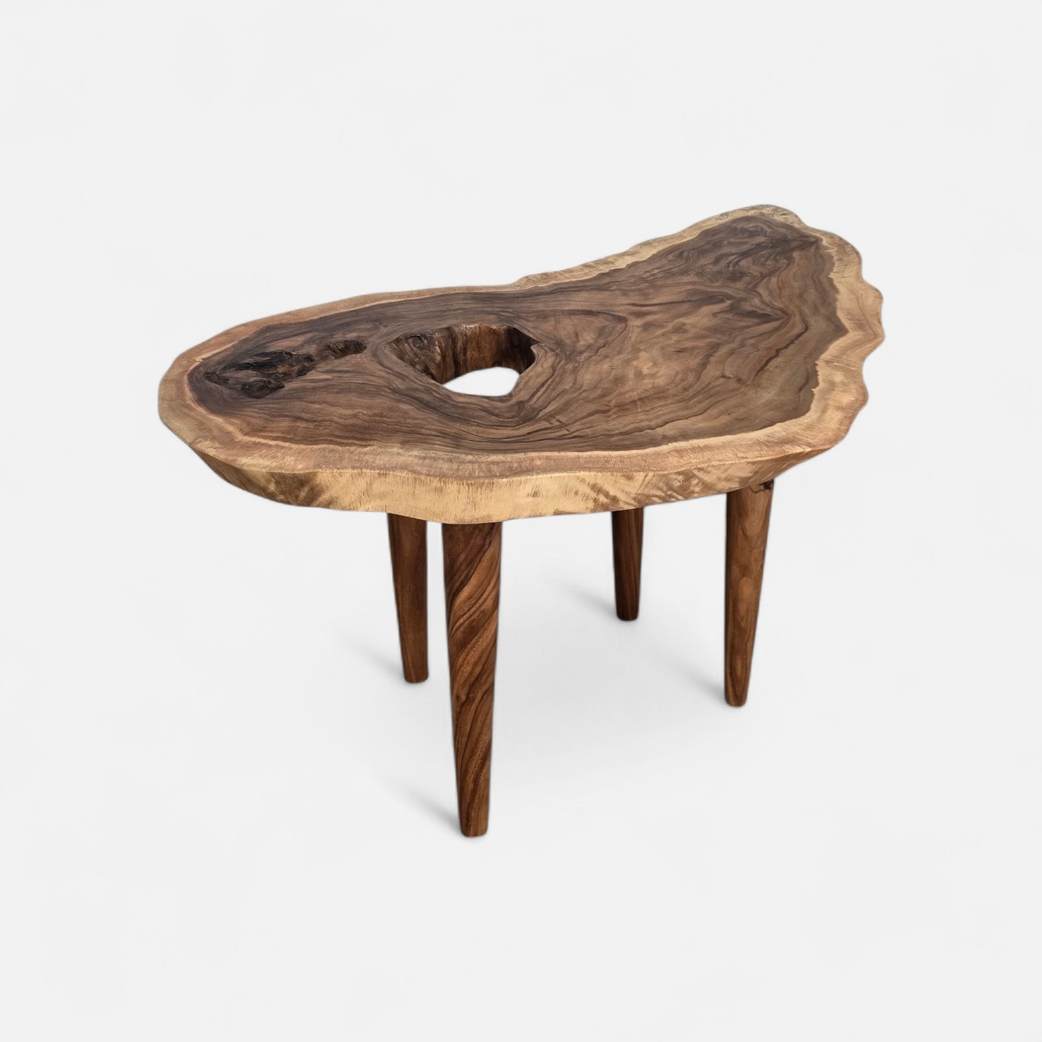 Masívna stolová doska v kombinácii s pevnými drevenými nohami zaručuje stabilitu, dlhú životnosť a vysokú kvalitu spracovania. Tento stolík z exotického dreva je ideálny do obývačky, reprezentatívnych priestorov či dizajnových interiérov, kde sa stane dominantným prvkom.