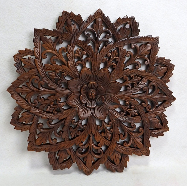 Dekorácia na stenu okrúhla LOTOS z exotického teaku (Tectona Grandis). Mohutná ručná drevorezba, dovoz Thajsko. Rozmer: priemer 60 cm, hrúbka dreva až 2,5-2,8 cm, svojou hrúbkou pôsobí veľmi honosne a majestátne.