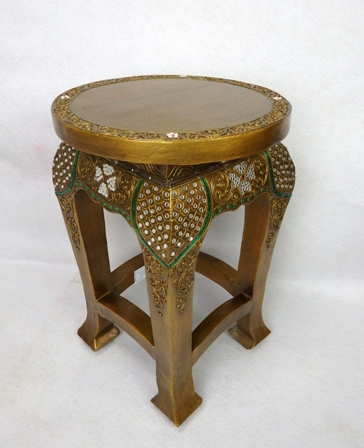 Luxusný stolík zo série CASTLE gold. Príručný stolík vhodný aj ako nočný je vyrobený z exotického dreva SUAR - Samanea Saman - nazývané aj Akácia. Je to ručne zdobený kúsok. Šperkárska práca šikovnej majsterky dáva tomuto jedinečnému kúsku nádych výnimočnosti a luxusu. Odlíšte sa od ostatných a zariaďte si originálny interiér. Rozmery: výška: 50 cm, priemer odkladacej plochy 35 cm. V tejto sérii aj skrinky a konferenčný stolík.
