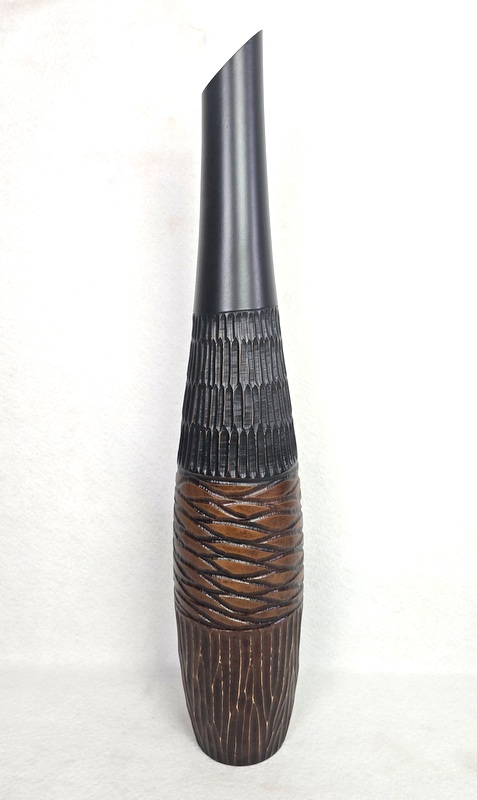 Drevená Váza čierno - hnedá vyrezávaná z exotického mangového dreva, ručná drevorezba. Veľmi elegantná luxusná váza s vyrezávaným vzorom. Rozmer: výška 80 cm, šírka 18 cm. Dovoz Thajsko. Vzhľadom na materiál je váza vhodná len na suché aranžovanie.