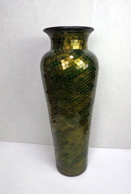 Luxusná dizajnová váza v zelených odtieňoch so zlatým perležovým nádychom. Keramická váza je na vrchu zdobená sklenenou mozaikou. Keďže sa jedná o ručnú prácu keramickej vázy aj maľovanej sklenenej mozaiky, každá váza je špecifická svojim tvarom a farebnosťou. Každá je originálnym umeleckým dielkom. Dovoz Indonézia. Krásna kombinácia farieb rozžiari Váš domov. Výška je 80 cm. Vázu používajte len na suché kvetinové dekorácie.
