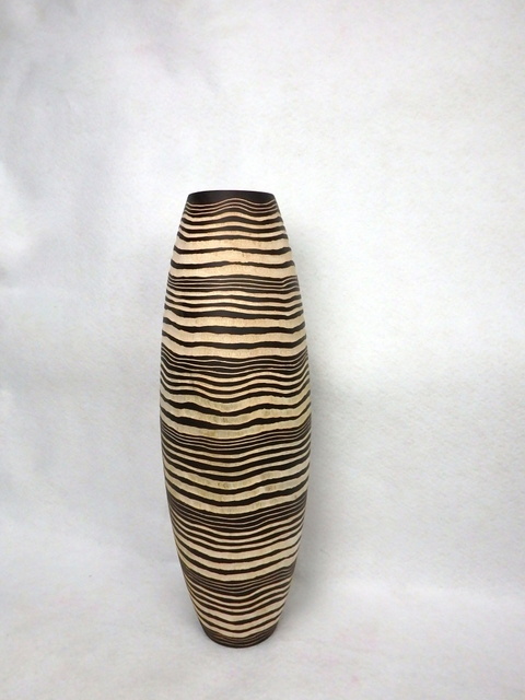 Luxusná váza vyrezávaná z mangového dreva, ručná drevorezba. Rozmer: výška 60cm, šírka 22 cm. Vlnkový vzor je plastický a je na váze vyrezávaný. Dovoz Thajsko. Vzhľadom na materiál je váza vhodná len na suché aranžovanie.
