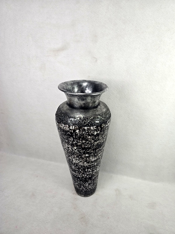 Luxusná dizajnová váza čierna-sivá so strieborným zdobením. Vrchná a spodná časť sú malované striebornou farbou a zdobené vzormi. Keďže sa jedná o ručnú prácu keramickej vázy aj maľovanej sklenenej mozaiky, ktorá je na vázy lepená, každá váza je špecifická svojim tvarom a farebnosťou. Dovoz Indonézia. Každá je originálnym umeleckým dielkom. Krásna kombinácia farieb rozžiari Váš domov. Výška je 80 cm. Vázu používajte len na suché kvetinové dekorácie.