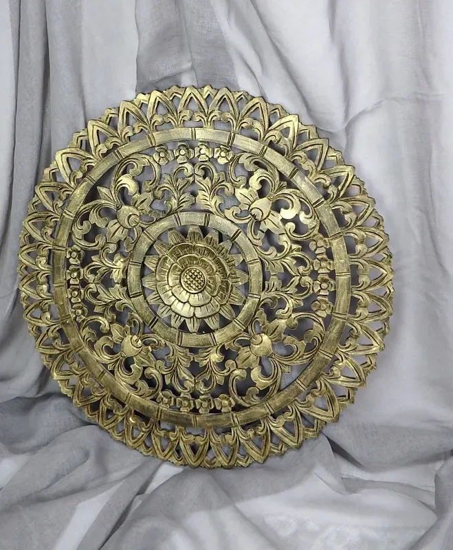 Krásna, jemná ako čipka, taká je táto zlatá mandala s čiernou patinou. Budí dojem kovového vzhľadu. Či už máte domov v modernom štýle alebo naturálnom, vždy si niekde nájde svoje miesto na obdiv. Vyrobená v Indonézii .