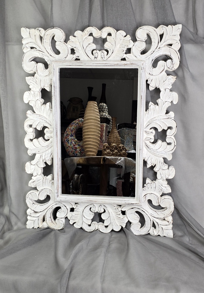 Zrkadlo s krásnym dreveným rámom - celkový rozmer 80x60 cm, hrúbka dreva až 3 cm. Rám je z exotického dreva SUAR , je ručne vyrezávaný majstrom z Indonézie. Možné zavesiť na výšku alebo na šírku. Kvalitný mohutný rám, vzadu sú dve ušká na zavesenie, zrkadlo je na zadnej strane spevnené doskou.