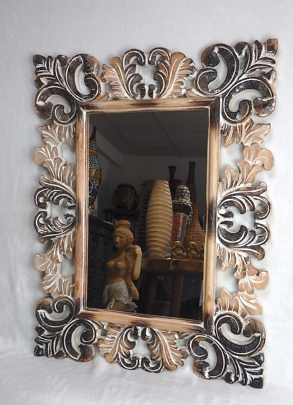 Zrkadlo s krásnym dreveným rámom celkový rozmer 80x60 cm, hrúbka dreva až 3 cm. Rám je z dreva SUAR , je ručne vyrezávaný majstrom z Indonézie. Možné zavesiť na výšku alebo na šírku. Kvalitný mohutný rám, vzadu sú dve ušká na zavesenie ,zrkadlo je na zadnej strane spevnené doskou. Dovoz Indonézia